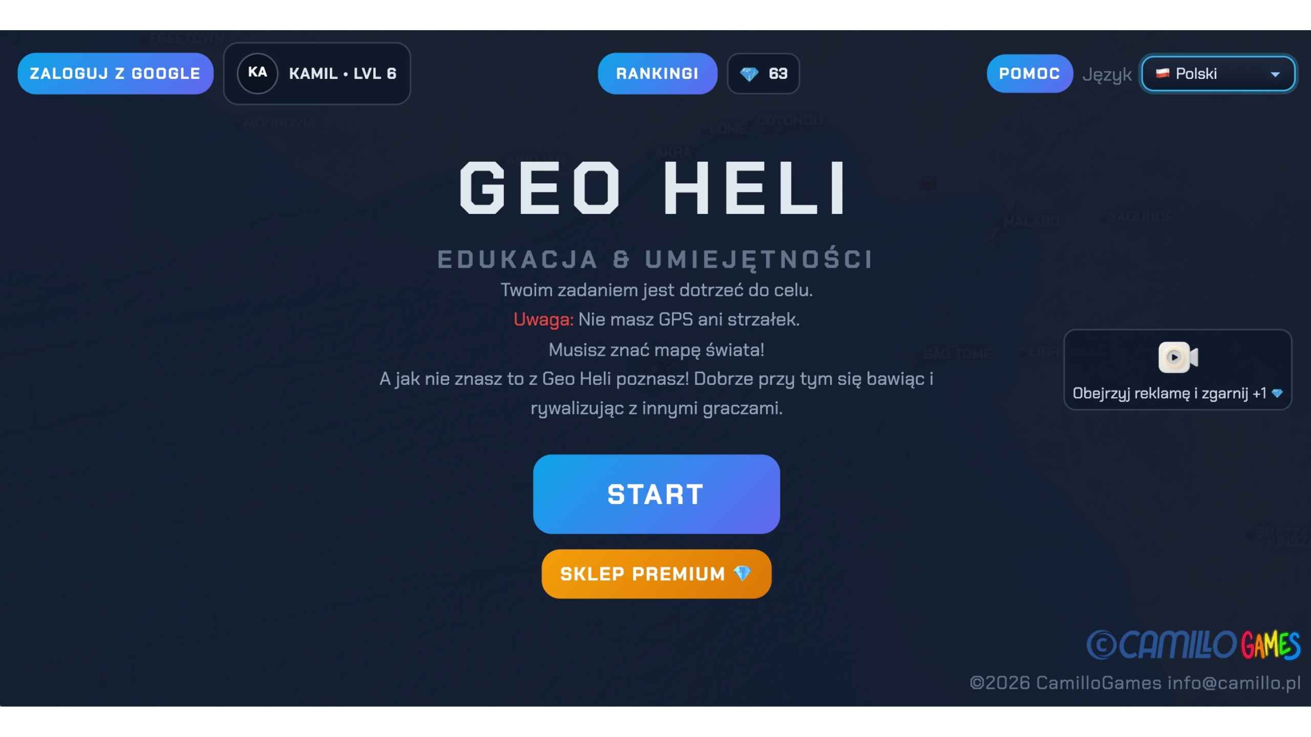 Myślisz, że znasz mapę świata? Czas to sprawdzić w akcji! Geo Heli to unikalne połączenie gry zręcznościowej z testem wiedzy geograficznej. Wsiadaj za stery helikoptera i wyrusz w podróż dookoła globu. Twój cel? Dotrzeć do wskazanej stolicy. Haczyk? Nie masz GPS ani strzałek nawigacyjnych!
